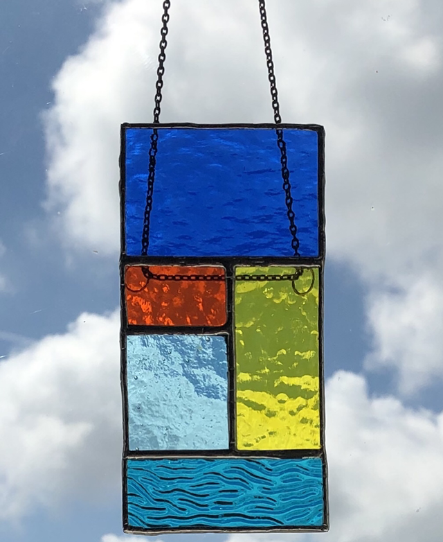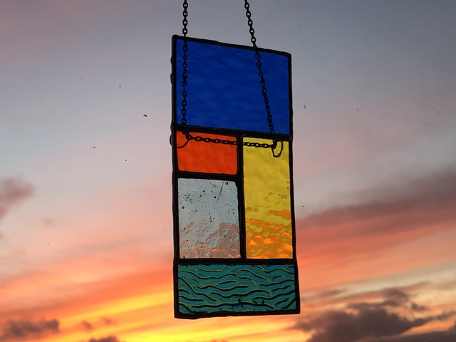 An abstract piece inspired by a visit to the seaside. The colours represent the Sky, the sun, the sand and the sea.